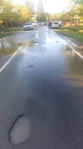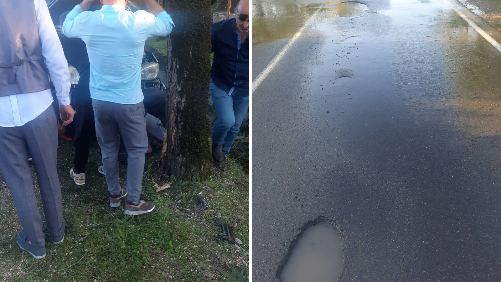 წყალი მილიდან ცენტრალურ გზაზე იღვრება. დაზიანებულ გზის მონაკვეთზე მოცურებული უკვე მერამდენე ავტომობილი შეეჯახა ხეს.