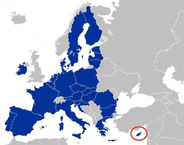 რუკაზე ჩანს ევროკავშირის წევრი ქვეყნები (ლურჯად) და მისი წევრი კვიპროსი, რომელიც ჩვენი არ იყოს, კარგადაა მოშორებული ბრიუსელიდან.