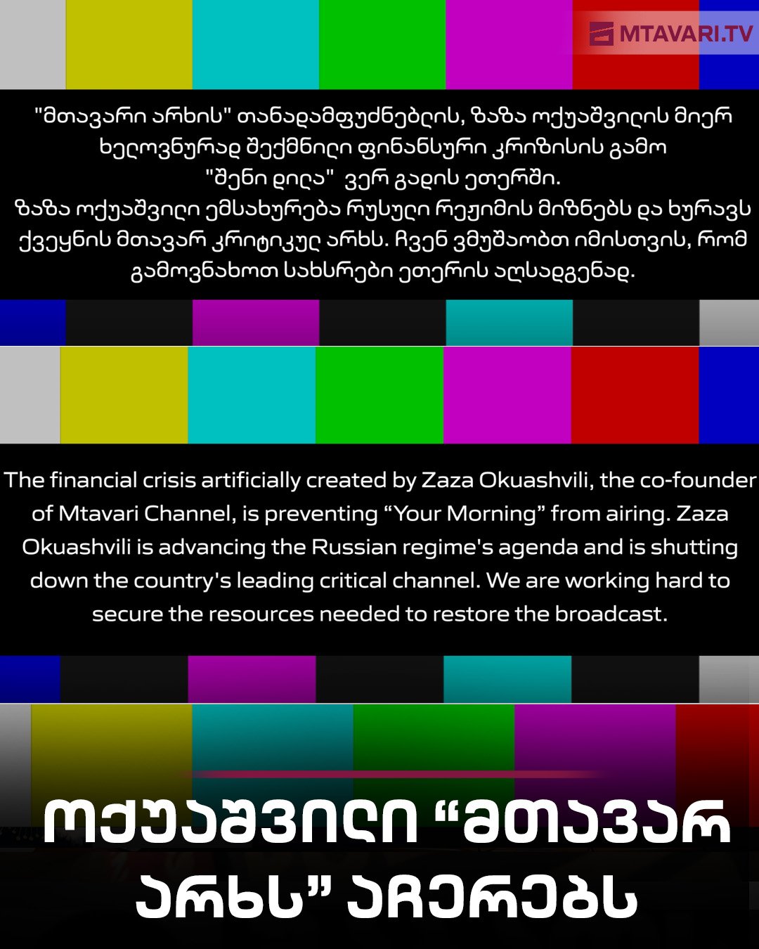 ზაზა ოქუაშვილი ემსახურება რუსული რეჟიმის მიზნებს და ხურავს ქვეყნის მთავარ კრიტიკულ არხს”, – წერს “მთავარი არხი”.