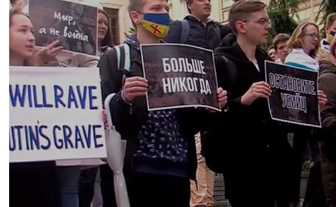 მე აქ ვდგავარ არა მარტო უკრაინის მხარდასაჭერად, არამედ რუსი ხალხის მხარდასაჭერად, რომლებიც წინააღმდეგი არიან ამ ომის, ტერორიზმის და პუტინის. ჩვენც ისეთვე ადამიანები ვართ, როგორიც უკრაინელები. არ გვინდა ომი, ჩვენ გვინდა მშვიდობა!, – ამბობს აქციის ერთ-ერთი მონაწილე.