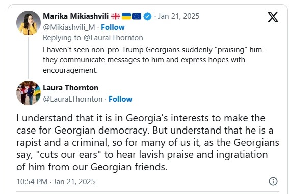 „მაკკეინის ინსტიტუტის“ გლობალური დემოკრატიის პროგრამების დირექტორმა, საქართველოში NDI-ის ოფისის ყოფილი ხელმძღვანელმა ლორა თორნტონმა აშშ-ის პრეზიდენტ დონალდ ტრამპს სექსუალური მოძალადე და დამნაშავე უწოდა.