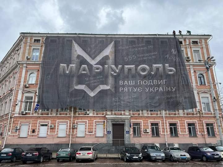 კიევში, ნაციონალური პოლიციის მთავარი სამმართველოს შენობაზე მარიუპოლის დამცველთა მხარდამჭერი ბანერი გამოფინეს წარწერით: