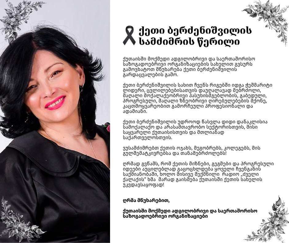 ქუთაისში მოქმედი ადგილობრივი და საერთაშორისო საზოგადოებრივი ორგანიზაციების სახელით გვსურს გამოვხატოთ მწუხარება ქეთი ბერძენიშვილის გარდაცვალების გამო.