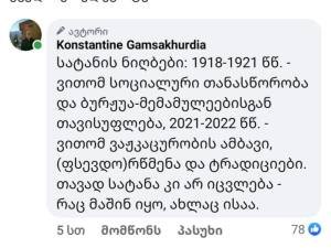 2021-2022 წწ. – ვითომ ვაჟკაცურობის ამბავი, (ფსევდო)რწმენა და ტრადიციები. თავად სატანა კი არ იცვლება – რაც მაშინ იყო, ახლაც ისაა.”-წერს კონსტანტინე გამსახურდია.