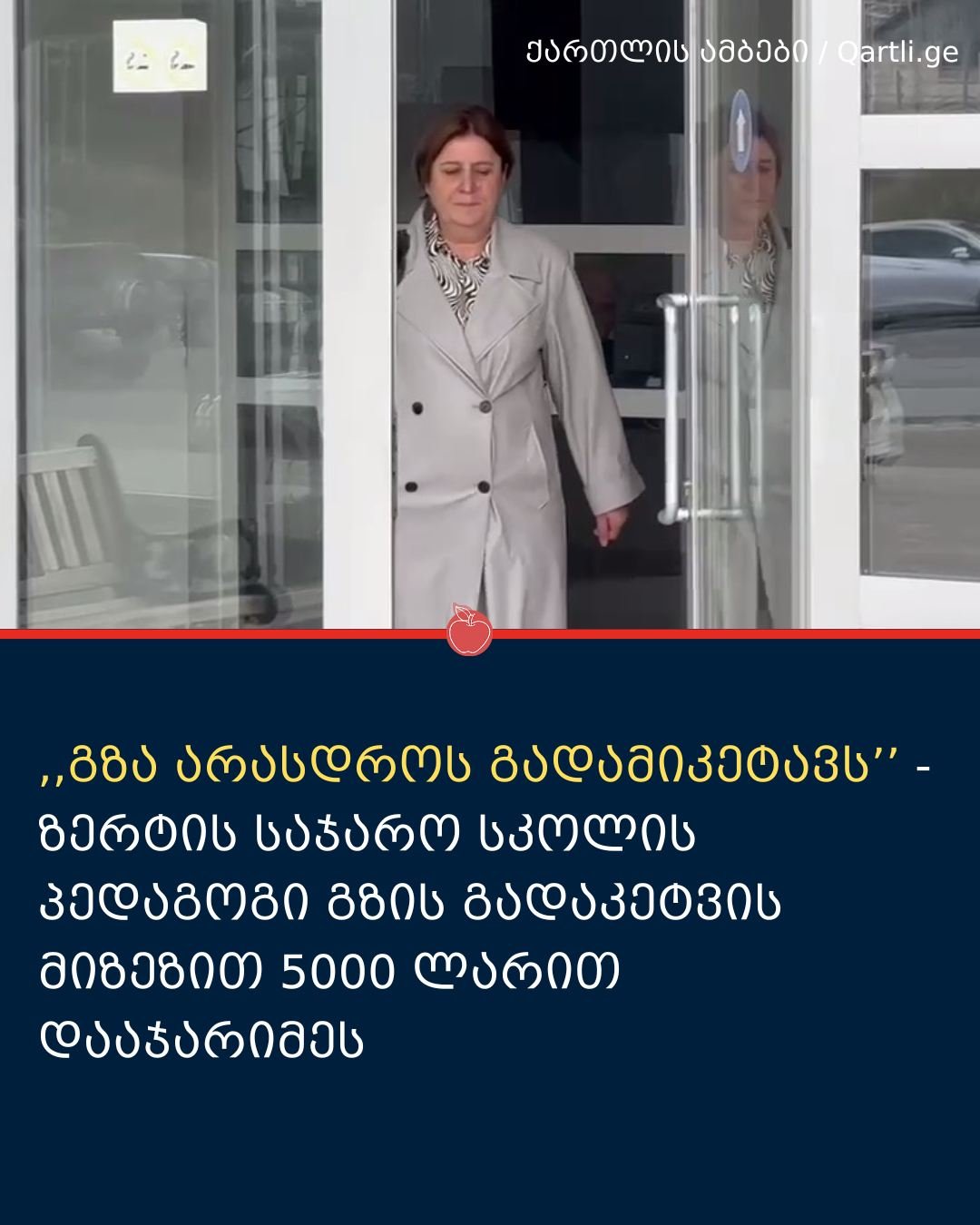 გორის მუნიციპალიტეტის სოფელ ზერტის საჯარო სკოლის პედაგოგი, ლალი ზუბიაშვილი 5000 ლარით დააჯარიმეს. მას შსს რუსთაველის გამზირზე ხელოვნურად გზის გადაკეტვას ედავება, რასაც პედაგოგი არ ადასტურებს და ამბობს რომ მას გზა არასდროს გადაუკეტავს: