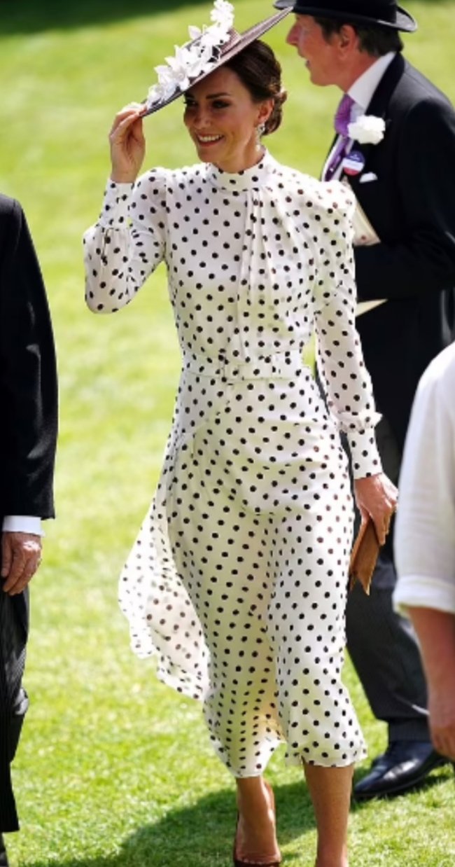 თეთრი კაბა, რომელსაც შავი კოპლები ამშვენებდა, 2 068 დოლარადაა შეფასებული. აღნიშნულ „ლუქს“ დიდი ზომის ქუდი ასრულებდა. ქეითი და პრინცი უილიამი რბოლაზე იმყოფებოდნენ.