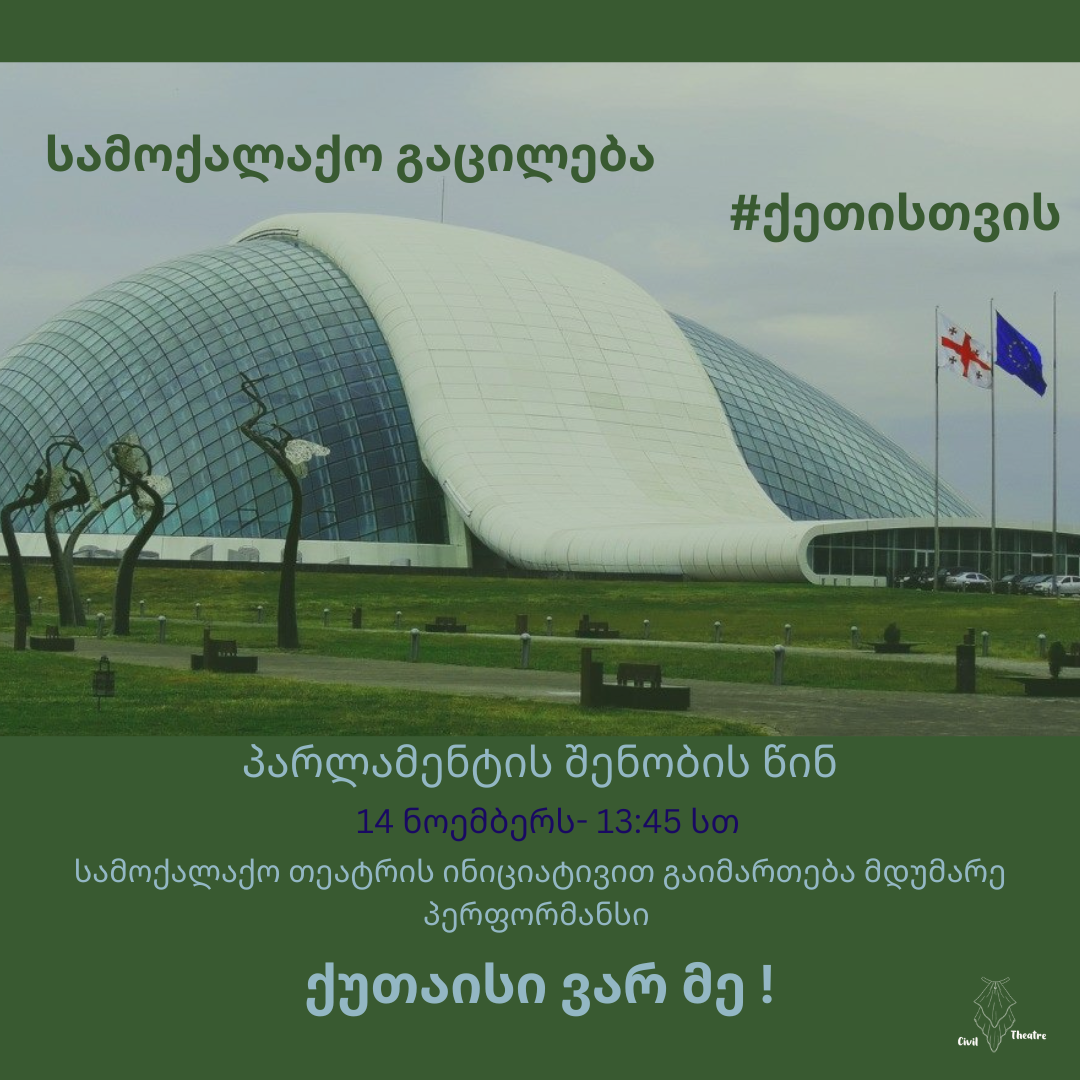ხვალვე, 13:45 საათზე, საქარათველოს პარლამენტის ყოფილ შენობასთან, სამოქალაქო თეატრის ორგანიზებით მდუმარე პერფორმანსი – “ქუთაისი ვარ მე” გაიმართება.
