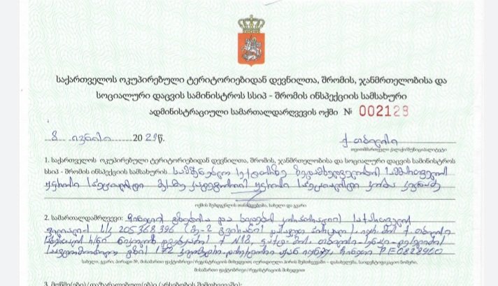 ,,2021 წლის 08 ივნისს, საქართველოს ოკუპირებული ტერიტორიებიდან დევნილთა, შრომის, ჯანმრთელობისა და სოციალური დაცვის სამინისტროს, სსიპ- შრომის ინსპექციის სამსახურის მიერ „შრომის უსაფრთხოების შესახებ“ საქართველოს ორგანული კანონის 22-ე მუხლის მე-2 პუნქტის “ბ.ე” ქვეპუნქტისა და 23-ე მუხლის მე-2 პუნქტის “ე” ქვეპუნქტის შესაბამისად შედგენილ იქნა ადმინისტრაციული სამართალდარღვევის შესახებ ოქმი დაუსწრებლად, “ჩინეთის გზებისა და ხიდების კორპორაციის საქართველოს ფილიალი”-ს (ს/ნ205368396) მიმართ. მიუხედავად იმისა, რომ კანონით დადგენილი წესით ეცნობა “ჩინეთის გზებისა და ხიდების კორპორაციის საქართველოს ფილიალი”-ს დირექტორს, ბ-ნ ჟან იანჟუს ოქმის შედგენის შესახებ, მან არ მიიღო ოქმის შედგენაში მონაწილეობა და უარი განაცხადა ოქმის ჩაბარებაზე. შესაბამისად, ოქმის მეორე პირი გაეგზავნა სამართალდამრღვევს ფოსტის მეშვეობით ორჯერ. ადმინისტრაციული სამართალდარღვევის N0022128 ოქმის ჩაუბარებლობის გამო, მიღებულ იქნა გადაწყვეტილება მისი საჯაროდ გამოქვეყნების თაობაზე. ოქმი განთავსებულია მიმაგრებულ მასალებში საჯაროდ”-წერია სამინისტროს ოფიციალურ გვერდზე.