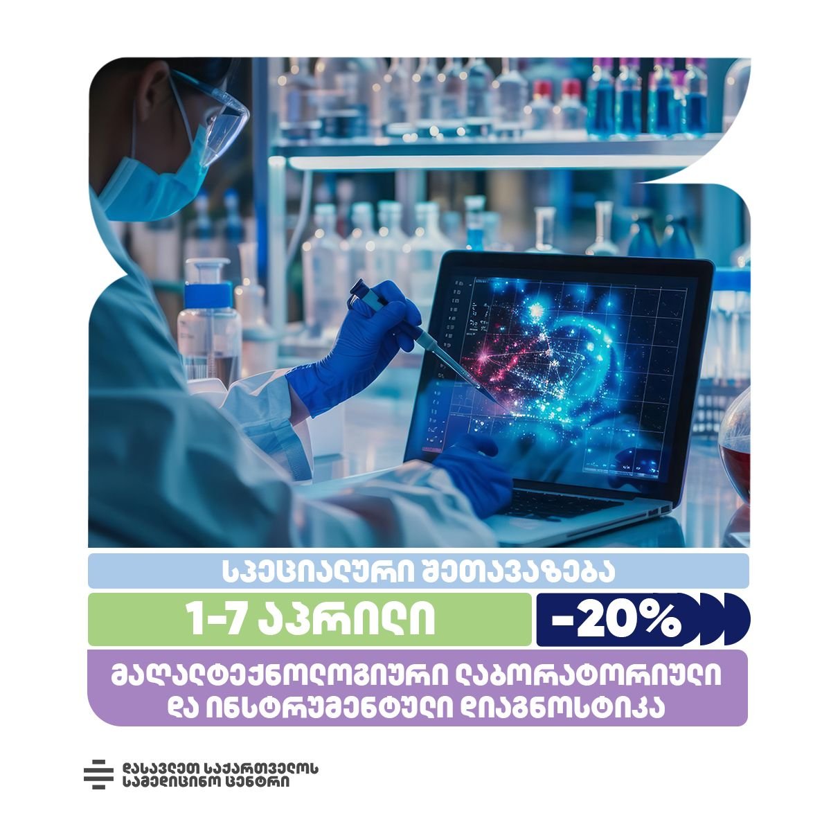 სპეციალური შეთავაზება: ექიმის მიერ დანიშნულ ყველა ლაბორატორიულ და რადიოლოგიურ კვლევაზე -20% ფასდაკლება – თანამედროვე დიაგნოსტიკური აპარატურა, ზუსტი დიაგნოზი, მაღალი სანდოობა!