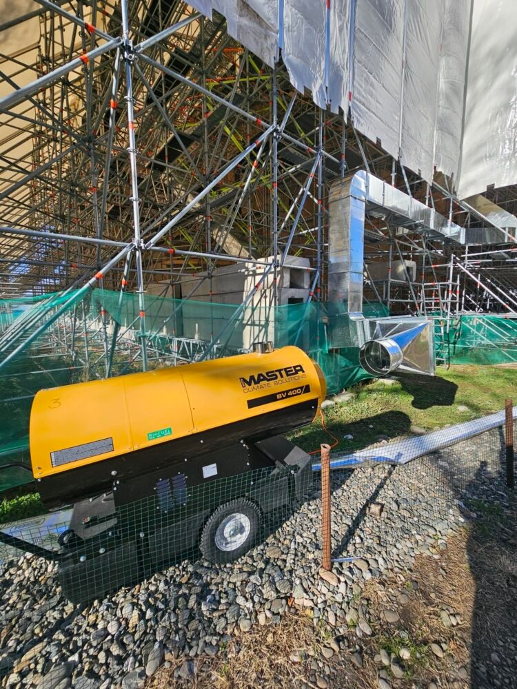 სპეციალისტების ჩართულობით დადგინდა, რომ გადახურვის მაღალტექნოლოგიური მატერიის გათბობა უნდა მოხდეს ან +2c-დან +4c-მდე (რაც თოვლის საფარის ეფექტური დნობის კუთხით სარისკოდ მიიჩნიეს), ან +9c-ის ზევით. შესაბამისად, სპეციალისტებმა საუკეთესო ტემპერატურულ დიაპაზონად +9c-დან +14c -მდე ტემპერატურა მიიჩნიეს. აღნიშნული ტემპერატურული დიაპაზონი (+9c – +14c) აზღვევს გადახურვის მაღალტექნოლოგიური მატერიის ქვედა მხარეს ნამის წარმოქმნისგან, ვინაიდან დადგინდა, რომ +5c- დან +8c-მდე ტემპერატურაზე მატერიის ქვედა მხრიდან წარმოიქმნებოდა ნამი (იხილეთ საფარის გათბობისა და ვენტილაციის პროექტი და სამშენებლო კლიმატოლოგიის დაპროექტების ნორმების ცხრილები). რაც შეეხება კრიტიკოსების მხრიდან წამოჭრილ საკითხს გათბობის სისტემის პერიოდული ფუნქციონირების შედეგად ტაძრის ფასადზე ნამის წარმოქმნის თაობაზე, ან როგორც დაასკვნეს, ტაძრის 140 სმ-იანი კედლების შიგნით, +14c-ის გავლენით, კედლის მხატვრობის დაზიანების საკითხს, ეს მოსაზრება ლოგიკის მიღმაა და ამაზე აღარ შევჩერდებით. აქვე გვინდა აღვნიშნოთ, რომ დამონტაჟებულ აგრეგატებს, გარდა ჰაერის შეთბობის ფუნქციისა (რომელიც ჩვენს შემთხვევაში მიმართულია კონსტრუქციის გადახურვის მატერიიის ძირის შეთბობისთვის და თოვლის დნობისთვის) გააჩნიათ შეუმთბარი/არსებული ჰაერის დაბერვის ფუნქციაც, რაც საჭიროების შემთხვევაში, ზაფხულის პერიოდში არსებული სივრცის ვენტილაციისთვის იქნება გამოყენებული.